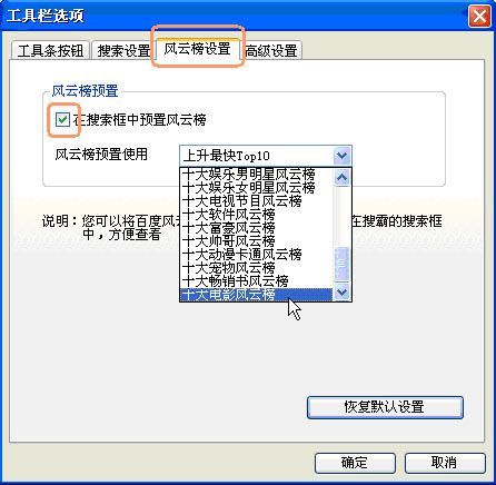 百度超级搜霸中风云榜的设置极其简单。鼠标点击图标,选择风云榜中感兴趣的话题,就可以在当前页面看到相关搜索结果,简单快速地得到你想要的信息。百度超级搜霸默认的是“上升最快TOP10”的内容。