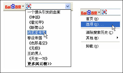 和笔者一样是电影发烧友?那就在超级搜霸LOGO菜单里选中[选项],进入[风云榜设置],在下拉菜单中选择十大电影风云榜就OK啦!看,多Easy!你可以随意将风云榜中的内容预设成自己喜欢的话题。关闭风云榜的功能同样简单。如下图所示:只要将风云榜预置下方的勾取消掉,搜索框中的图标就随之消失了。
