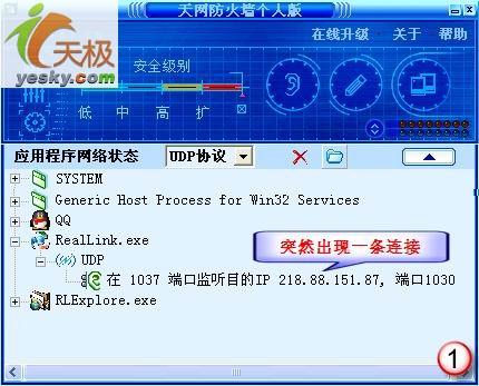 天网防火墙是天网安全实验室(http://www.sky.net.cn/)推出的专业软件防火墙,该软件的网络监控功能能够显示本地计算机全部的监听端口和已连接的端口,当然了,它也能显示全部和本地计算机已连接的主机的IP地址。下面,我们用RealLink来做个试验。
