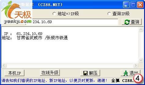 QQ的珊瑚虫版中有一个IP地址和地理位置互查的小工具,打开这个工具,输入黑客的IP地址,我们就可以得到黑客所处的地理位置(如图4)。