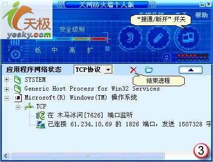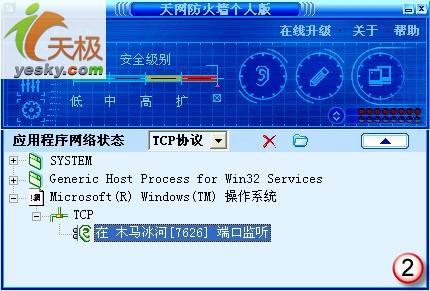利用天网防火墙的这一功能,我们还可以查看自己是否中了黑客的木马,查看控制我们电脑的黑客的IP地址。