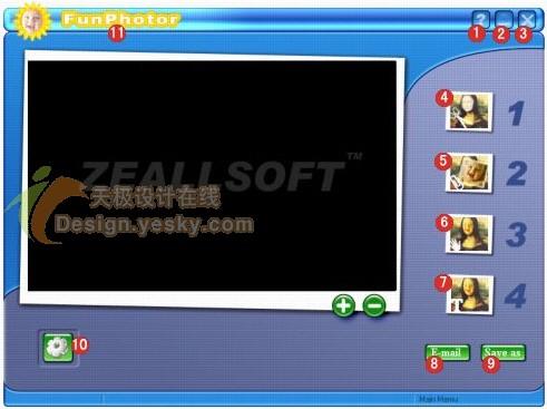如图1中所示,简单介绍一下界面元素:1为帮助,2为最小化按钮,3为关闭按钮,4为模板选择按钮,5为图片选择按钮,6为屏幕调整按钮,7为添加文本按钮,8为启动邮件程序按钮,9为另存图片按钮,10为软件注册和其它功能按钮,11为显示程序启动画面按钮。而中间有ZEALLSOFT字样的窗口用于显示模板与图像。
