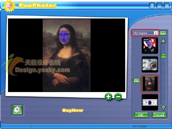 单击主界面右侧的模板选择按钮(右侧标注为“1”),这时出现大量模板可供选择,从上方的下拉列表中可以选择多种模板类别,下方列出的是该类别中的模板。这里选择默认类别中的一幅蒙娜丽莎模板,如图2所示。单击OK回到主界面。