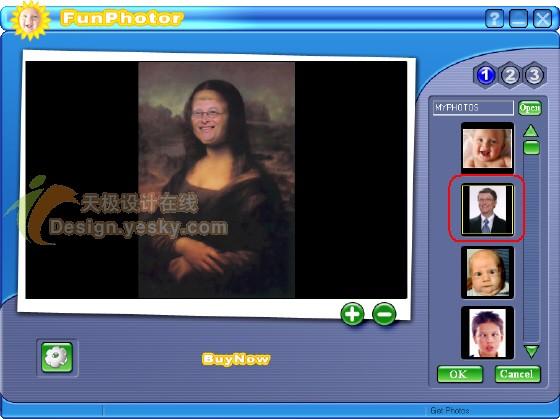 单击主界面右侧的图片选择按钮(右侧标注为“2”),选择一幅被整蛊对象,在图片显示窗口中可以使用抓手移动图片,稍作调整后如图3所示。如果要选择其它照片,可以单击“Open”按钮找到并打开。单击OK回到主界面。
