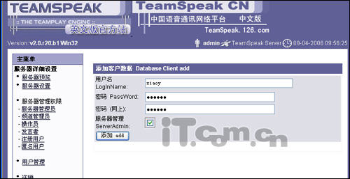 为了防止匿名登录,我们最好给每个登录的朋友注册一下用户名和密码,点击页面左面的“用户管理”,在显示的页面中点击“add client”进行添加,输入要注册的用户名、密码,如果需要他管理服务器,那可以把下面的“服务器管理”选中,再点击“添加”按钮就可以了(如图7)。