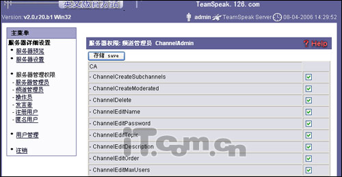 我们还可以来设置一些人员的权限,如管理员、发言者、注册用户和匿名用户等,他们的权限都是不相同的。点击左面“服务器管理权限”下面的相应用户就可以来设置权限了,我们可以根据自己的使用情况来设置相应的权限,选好后别忘了点击“Save”按钮(如图3)。