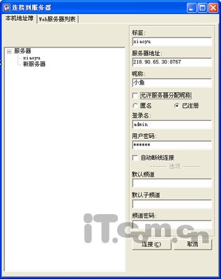 打开TS客户端软件,点击菜单“文件-连接”,在“连接到服务器”窗口中的“服务器地址”中输入“服务器IP:8767”,“8767”是默认的端口,再输入昵称、选中“已注册”,如果是匿名登录,那可以选择“匿名”,再用admin的帐号和密码来登录TS服务器(如图5)。