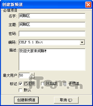 登录成功后我们就可以来使用了,如果是管理员帐号登录的,那可以来建立固定频道。右点击服务器名称来选择“创建新频道”,在“频道新创建”窗口中就可以输入频道的名称、主题、最大用户等内容,还可以来设置密码,把下面的“已注册”选中,如果不选中,那这个频道就是一个临时频道,等你退出TS后就会消失,最后点击“创建新频道”按钮就可以完成创建了(如图6)。