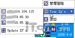 现在我们可以通过TS的客户端软件来登录服务器了。TS服务器的IP地址,只要右击系统图片处的TS服务器软件图标,在“Your Ip’s”下就可以看见IP地址了(如图4)。