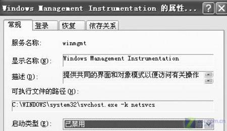 步骤2:在Windows Management Instrumentation服务列表名称处,单击“右键”按钮,选择“属性”标签,会弹出“服务属性”对话框。然后将启动类型改为已禁用(如图2),单击“确定”按钮,执行该操作。在返回到服务操作界面,再次选择该项服务,单击“右键”按钮,选择“暂停”将服务停止。