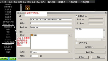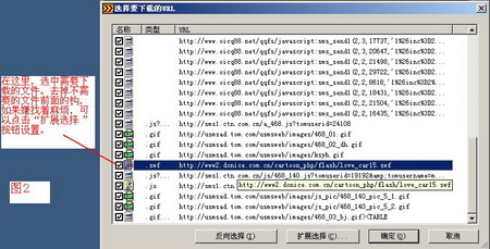 可以这样:点击Flash所在的页面,按Ctrl+A“全选”,然后在被选中而变颜色的对象上面(一般是文字,图片等)拖到悬浮窗口里面,马上就出现“选择要下载URL” 的窗口(如图2)。在里面你可以随心所欲的选择要下载的文件,打上钩就可以了。