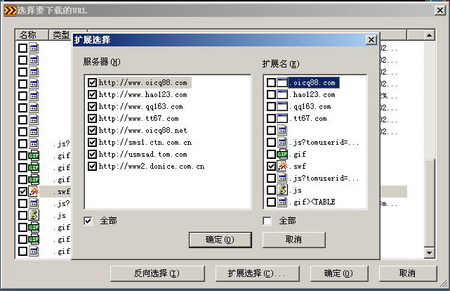 提示:如果出现的东西太多不方便的话,可以在那个窗口里面点击“扩展选择”按钮(Flashget中为“选定特定”按钮),选中要下载文件的地址和类型(如图3)。按确定,就开始下载网站原来不让下载的文件了。