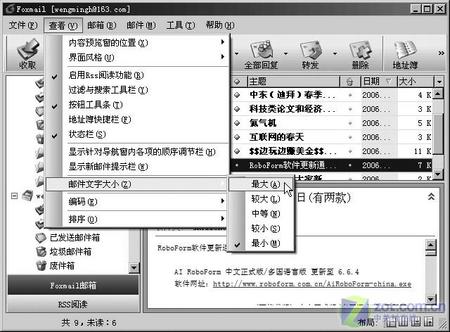 如果是直接Foxmail主窗口中查看邮件,只需点击菜单“查看/邮件文字大小”(如图2),选择具体文字大小命令即可更改调整邮件的文字大小。双击后打开邮件窗口,虽然也有相应的菜单项,其实在此窗口中连续点击工具栏上的“文字大小”按钮可以分级更改邮件文字的大小。