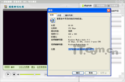 首先我们要把这二个软件都安装好,这样就可以开始录制了。运行“超级播霸”,打开要播放比赛的频道,等显示播放视频的时候,在视频上点击鼠标右键来选择“属性”,接着在 “属性”窗口中把“位置”栏后面的地址复制下来,后面录制的时候需要用到这个地址,然后最小化“超级播霸”,不要关闭它(如图1)。