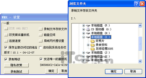 这时打开“WM Recorder”(如果在线的视频链接是real流视频,那就要打开“RM Recorder”),首次运行要进行一下设置,软件默认是把录制的视频保存在C盘中,所以要修改一下视频保存的文件夹,点击主界面上的“设置”按钮,在“设置”窗口中点击“录制文件存放文件”按钮来选择一个比较大的分区,这样就可以录制更长时间的视频,设置好后关闭“WM Recorder”(如图2)。