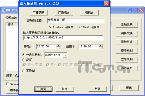接下来打开“WM VCR”,点击右面的“添加放映”按钮,在弹出的窗口中就可以来设置录制的参数了,先在“放映的名称”中输入录制视频的名称,选择一个流媒体的类别,接着把上面的在线视频地址复制到流媒体地址栏中,再设置一下录制的开始和结束时间,具体的时间可以根据世界杯的赛程进行设置,不过为了防止在线视频的延时问题,我们可以把录制的时间根据赛程表提前10分钟开始录制和延后10分钟结束录制,这样就可以录制完整的比赛了,全部设置好后点击“确定”按钮。软件还支持多任务录制,这样就算一个晚上有几场比赛,我们可以根据不同的时间、不同的流媒体地址来添加多个录制任务。(如图3)。
