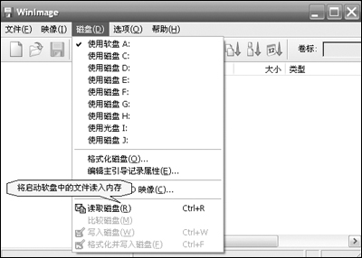 如果你手头可以找到Windows 9x/Me启动软盘,可以在WinImage中选择“磁盘→读取磁盘”命令(见图1),将软盘保存为IMG格式的镜像文件。