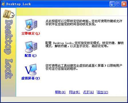首先要对Desktop Lock V7.0进行安装,安装很简单,只需根据提示一路next下去就可以完成安装。接下来就可以启动Desktop Lock V7.0来对电脑进行锁定。Desktop Lock V7.0的主界面有三个选项,分别是立即锁定、配置和虚拟屏幕,首先要点击配置来对该软件进行设置(图1)。