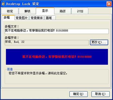 锁定电脑之后,用Desktop Lock V7.0还可以给其他人留下一些信息。在条幅文本中可以设置一段话,而且还可以设定字体的颜色和大小(图4)。这样这段话在锁定电脑之后,就可以在屏幕上显示。如果要是不想留信息,留照片也是可以的。在Desktop Lock V7.0设定中显示里面选择背景图片,然后选择图片即可,并且还可以选择图片的显示模式,这样锁定电脑之后,就会显示指定的图片。