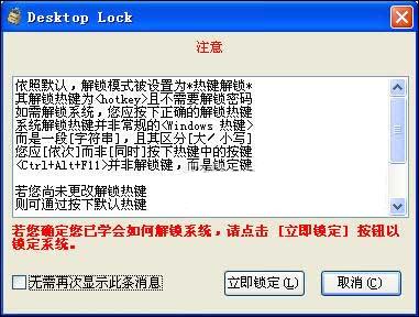 阿文对Desktop Lock V7.0都设置好之后,最后点击立即锁定按钮,就可以将电脑进行锁定(图8),这样以后他再也不用担心因为电脑没在旁边,而被别人随便使用了。
