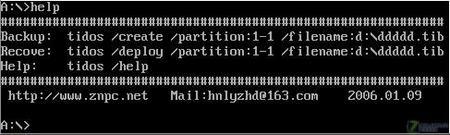2:压缩包提供的TIDOS.EXE程序是一个命令行程序,可以用批处理来自动执行备份和恢复任务,用法你在DOS下键入HELP.BAT就可以看到笔者以备份C盘到D盘以及从D盘恢复镜像到C盘的示例,其他详细参数你可以通用TIDOS /HELP得到,这里不再详述。