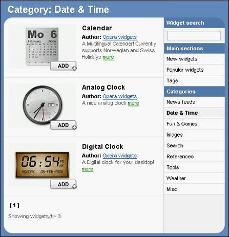 在该版本中开发人员加入了对widgets控件的支持,利用这些控件可以方便地查看日历、时间等,而且界面非常漂亮。这些控件类似于苹果电脑上的Dashboard功能,实际上这些控件都是一些独立于Opera浏览器以外的一些小巧的程序,这些小控件可以把来自于网络上的一些信息显示在我们的桌面上。