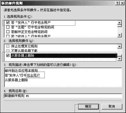 其实我们可以利用“OutlookExpress”的邮件规则就可以,依次打开菜单“工具/邮件规则/邮件”,点击“新建”按钮,新建一个邮件规则,在打开的窗口第一栏中勾选“若发件人包含用户”项,然后在第三栏中点击带下划线的值进行编辑(如图1、2)。例如我们不信任来自aaa.com的所有邮件,就可在其中填入aaa.com这个域名,单击“添加”将其加入,在第二栏中勾选 “从服务器上删除”,最后按“确定”完成规则制定。这样以后在收取邮件时就可直接清除那些垃圾邮件,不会再保留到本地硬盘中去了。