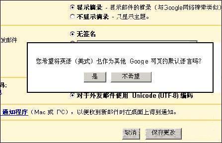 如果您在这里选择“是”的话,将影响到所有用Google帐户打开的WEB页,例如:搜索首页、个性化主页、Gmail的登陆页面、Google帐户设置等等。所以建议此处选择:不希望重新进入页面后,发现所有的文字都变成了E文,最大的不同,就数浮在所有窗口最上方的半透明状的一行文字: