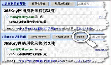 尽管Gmail的容量如同首页上那一长串的数字在增大,但一封令人不快的邮件没有保存的必要,要是在以前,只有通过下拉式菜单的操作才能删除邮件,这一点当笔者最初使用Gmail的时候感觉很郁闷,现在终于好啦!
