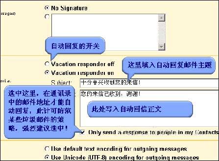 试想一下,这对出去旅游、长时间不能上网的人多么重要!现在好像只有@YAHOO.COM.CN中有定时自动回复设置,但总时间段不超过180天,没有像Gmail具备选择性回复的功能。