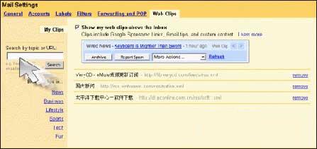 其实这是Gmail最新推出的利用Gmail界面来进行RSS浏览的功能。点击Settings可以看到最后一项设置就是这个的,Google称之为:Web Clips(网上剪报)