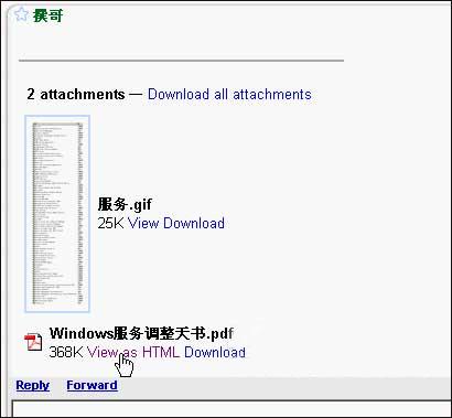 在上面这张图中可以很清楚的看出这封信是带有两个附件的,一个是缩略图表示的图片,一个是PDF文件。简单点击“Download all attachments”下载到的文件是ZIP格式的,Gmail自动将两个文件打包方便下载,这招适合邮件带有大量附件的时候特别管用。另外,对于PDF、OFFICE等文件Gmail则提供了直接打开的支持:点击“View as HTML”则开新窗口直接浏览文件,经本人测试效果相当之好,甚至对Gmail破解了这些文件感到吃惊,要知道,目前如果要在浏览器中直接打开PDF文件,至少也要安装Adobe Reader 7同时选择安装IE控件才能看,现在Gmail为我们提供了全新的阅读方案:在网吧、甚至没有装阅读器的地方,一样能获得很好的阅读体验!根据Google的描述,以后会增加更多的文件支持。目前可以用这种方法直接阅读的文件格式有:pdf, .doc, .xls, .ppt, .rtf, .sxw, .sxc, .sxi, .sdw, .sdc, .sdd, and .wml.