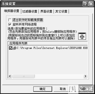 将嗅探器安装完毕,而后依次选择"工具/设置"命令,在打开的对话框中单击"嗅探器设置"选项卡,勾选页面中"监听所有网络进程"选项(图1)。