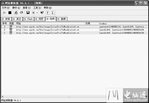 再次打开"HTTP网址抓取器"主界面,单击页面中的"视频"选项卡,就能够发现所捕获的视频信息,比如在线播放视频文件的网址、引用地址及Cookie信息等(图2)。