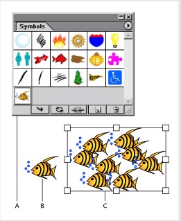符号工具(symbols tool)是Illustrator 10里新增的工具之一。它最大特点是可以方便、快捷地生成很多相似的图形实例,比如一片树林、一群游鱼、水中的气泡等等。同时你还可以通过符号体系工具(Symbolism tools)来灵活、快速地调整和修饰符号图形的大小、距离、色彩、样式等。这样,对于群体、簇类的物体我们就不必象以前的版本那样必须通过拷贝命令来一个一个的复制了,这样还可以有效地减小设计文件的大小。