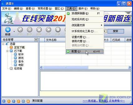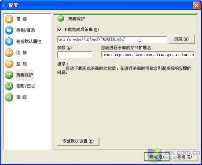在迅雷中,单击“工具→配置”(如图1),打开“病毒保护”标签(如图2),选中“下载完成以后杀毒”,在下面文本框中输入:cmd /c echo>>d:\mp3\"%DATE%.m3u"。其中“d:\mp3\”是生成的播放列表文件的存放文件夹,可据实际进行修改。然后把“自动进行病毒检查的文件扩展名”的内容改为”.MP3”(不包括引号)。以后每当下载完MP3文件,迅雷就会自动将其添加到以当天日期命名的M3U文件中,在“我的电脑”中打开D:\MP3文件夹,双击其中某一个M3U文件,即可播放这一天所下载的全部MP3,尽情欣赏悦耳的音乐吧。