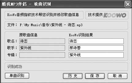 如果歌曲缺少ID3信息,常常会造成千千静听在下载歌词时失败情况。现在千千静听与“酷我MP3伴侣”合作,利用其独有的音频指纹技术通过歌曲旋律来识别和修正歌曲的ID3信息,从而提高歌词下载的成功率。同时安装了新版千千静听和“酷我MP3伴侣”后,当“歌词秀”窗口中显示“用酷我识别歌曲,找到歌词”选项时,点击它即可打开“酷我MP3伴侣-歌曲识别”窗口进行音乐识别,识别成功后点击“保存”按钮即可自动修正歌曲的ID3信息(如图1)。