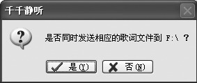 使用千千静听的“发送到”功能可以将当前播放的歌曲快速拷贝到MP3机里,新版的千千静听还可以把对应歌曲的歌词同步发送到MP3机里。在“播放列表”中选中歌曲,用右键点击歌曲并选择“发送到”功能拷贝歌曲时,会弹出“是否同时发送相应的歌词到”提示(如图2),点击“是”按钮即可将歌曲与歌词同步同时发送到目的地。如果歌词与歌曲的文件名不同,千千静听还会自动将歌词文件的主文件名改为与歌曲的文件名,以便歌词可以在用户的MP3机中正常显示。