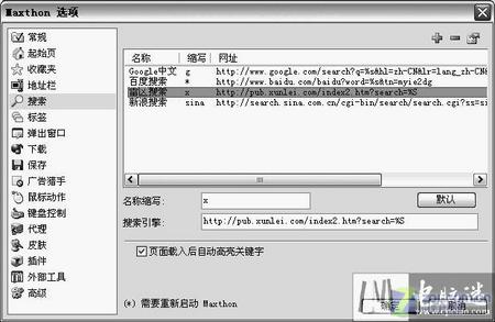 第二步:更改新搜索引擎名称为“雷区搜索”(如图),名称缩写为“x”,搜索引擎网址为“http://pub.xunlei.com/index2.htm?search=%S”(不含双引号,尤其注意最后一个字母必须为大写S,切记!),最后按下“确定”按钮,就可以发现Maxthon搜索框下拉菜单中已经出现“雷区搜索”引擎,要使用雷区搜索时不必再切换到迅雷中,直接在搜索文本框中输入资源名称就可直达雷区,让你搜索和下载全都“迅雷不及掩耳”。