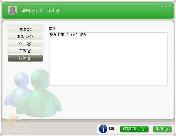 首先右键单击好友的键头像图标,然后从弹出菜单中选择“编辑联系人”,在“编辑联系人”对话框中单击左上角的“注释”,输入该好友的一些关键信息,如图1所示,不同的关键词之间可以用空格或逗号隔开,输入完成单击“保存联系人”。用同样的方法为其它好友添加类似的注释。这样添加注释要花一些时间,但却可以一劳永逸。