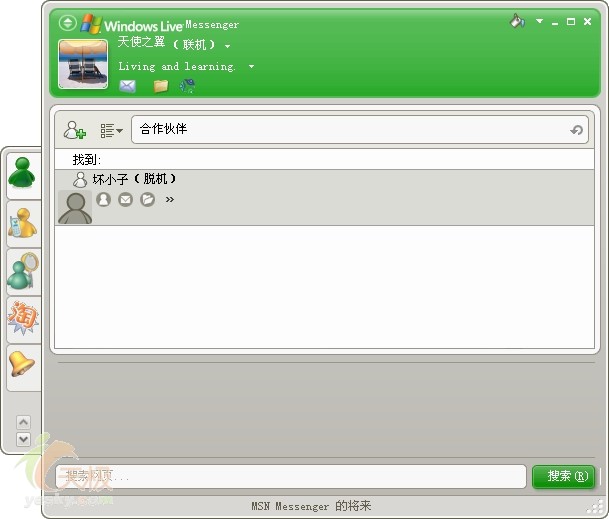 当下次需要查找某个好友时,只需要在MSN8窗口中的“查找联系人或号码”输入框中输入一个关键词,如“合作伙伴”,由于MSN8具有Word Wheel功能,下方的好友列表中就只显示注释中包含该关键词的好友,如图2所示。这种方法比分组功能更加实用,是因为它允许一位好友出现在多个不同的“组”中,并且能够借助Word Wheel功能快速找到某一“组”中的好友,有了这种方法,我们可以跟MSN8真正的分组功能说BYE BYE了。