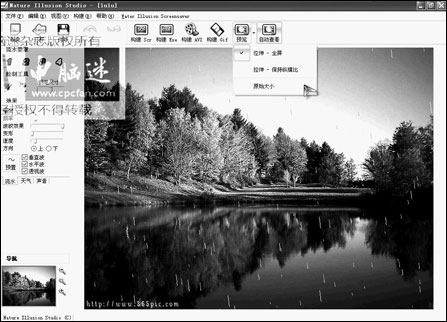 提示:单击“预置”按钮,选择“载入”菜单。可以看到软件预置了海洋、平静的海洋、河流、瀑布、涟漪、湖泊、涟漪表面、火焰/迷雾/烟雾和大瀑布9种特效方案,为制造出身临其境的美景提供了便利。