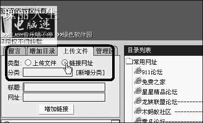 登录永硕网盘www.ys168.com,点击“注册E盘”,按提示注册一个免费的永硕网盘(30M空间,单个文件3M);用二级域名http://XXXXX(自己的用户名).ys168.com登录自己的网盘;选择“上传文件”项,将上传文件类型定义为“链接网址”,在下面的名称和网址项填上合适内容,点击“增加链接”按钮,就可以了。赶快将自己的网盘地址发送给好友,大家一起资源共享(如图1)!