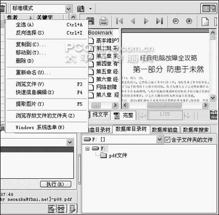 在“数据库目录树”和“数据库磁盘”窗口中选中分区或目录名即可查看它下面已检索出来的PDF文档记录。在“数据库”选项中还提供了数据库的“维护”(清除无用的数据信息)、“备份”和“还原”操作,以保证数据库信息的准确和安全。