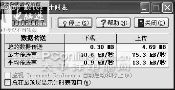 首先先关闭其它所有会连接网络的程序,然后用右键单击图标选择“计时表”选项,点击“启动”按钮后“DU Meter”软件就开始监测和统计当前的网络流量数据。此时再运行迅雷程序,不进行任何操作来测试它的上传流量,所有的数据都会同步显示在“计时表”对话框中(如图2),一目了然,这样你就可以知道迅雷的真实上传流量了。