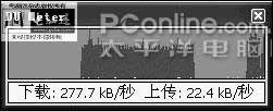 启动软件后,它会在系统托盘区驻留一个上下箭头标志的图标,此时会在右下角弹出一个浮动窗口,用来显示当前的网络流量状态。除了直接显示下载和上传速度外(该数据每1秒就刷新一次),还会用曲线图的方式来让你掌握近一段时间内的上传和下载峰值。默认状态下红色曲线表示下载流量,绿色曲线表示上传流量,曲线越高说明此一段时间下载或上传流量越大(如图1)。通过查看速度值和曲线图的状态就可以准确掌握电脑的网络流量了。比如当你没有浏览网页,没有收发Mail和QQ聊天等,却发现系统一直在向外上传数据,此时就要当心,是不是电脑中有病毒或木马程序正在偷偷向外发送数据了。