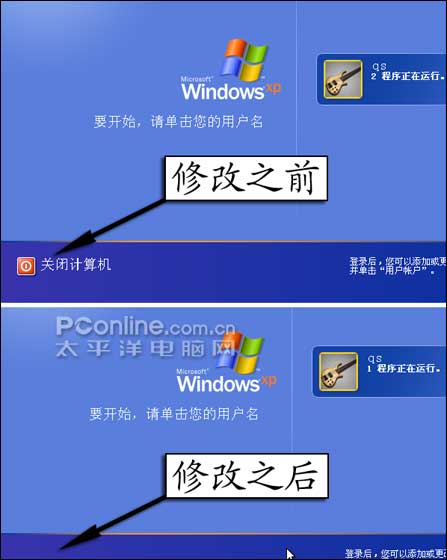 现在,再点击“Windows+L”锁定计算机看看,左下角的“关闭计算机”按钮是不是已经消失得无影无踪了(如图),上面是设置前的锁定计算机界面,下方的设置后的锁定计算机界面。
