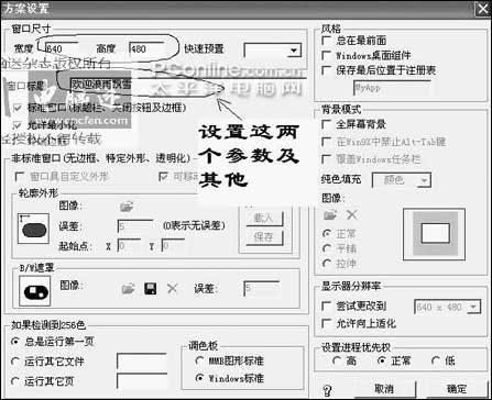 第一步::新建的MMB文档,依次点击“方案/方案设置”。在弹出的“方案设置”对话框中,设置相应的参数,如“窗口尺寸”(一般为640×480)、“窗口标题”(在启动菜单顶端显示的文字,如“欢迎使用XXX”)等(如图1)。
