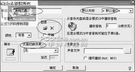 第二步:设置“页面属性”。双击“页面1”,会弹出一个“页面属性”窗口,设置属性中的相关内容。 如“标签名称”:即该页的名称,可名为“系统工具”或“其它”,设置它,主要是以后用作链接之用(如图2)。接下来,再设置“默认光标”、“背景着色”、“背景音乐”、“页面切换效果”等效果。当然,一切设置完成后,别忘了点击“确定”。