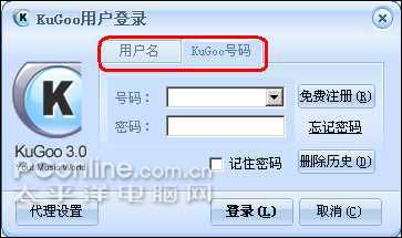 现在酷狗的V3版本里可以,在登录框中有两种方式登录酷狗(KuGoo),第一种是从用户名来登入酷狗,另一个是从注册的酷狗帐号来登入,这样大大的方便了用户的登入。(如图1)